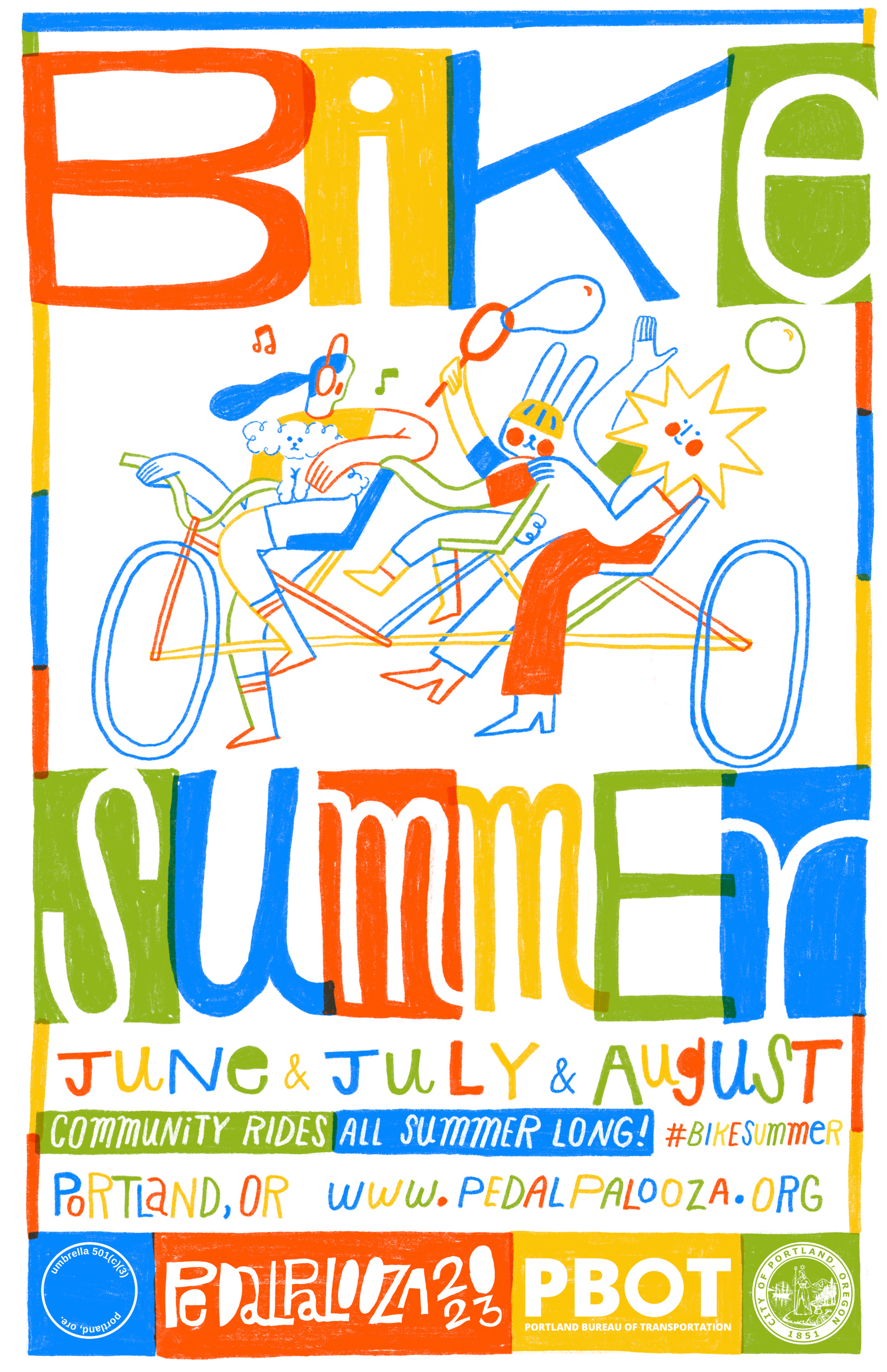 Bike Summer (aka Pedalpalooza) is a festival of bikey fun. Hundreds of different events are organized by people like you. Most rides are free and all are open to the public to join.